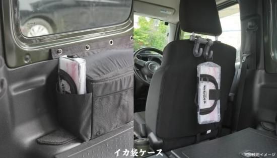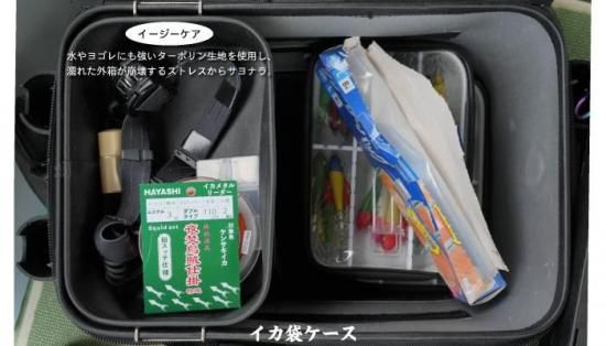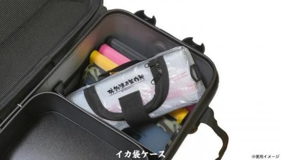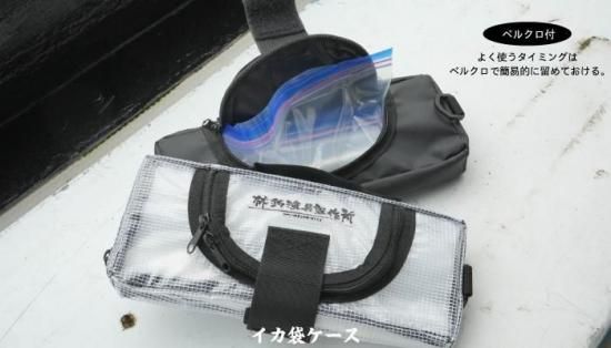 イカ釣りには必需品のジッパー付き袋の収納ケース。頑丈なターポリン生地でできている為、水に強く地面や磯に直置きしても問題無し!小物入れとしての使い勝手も抜群です。